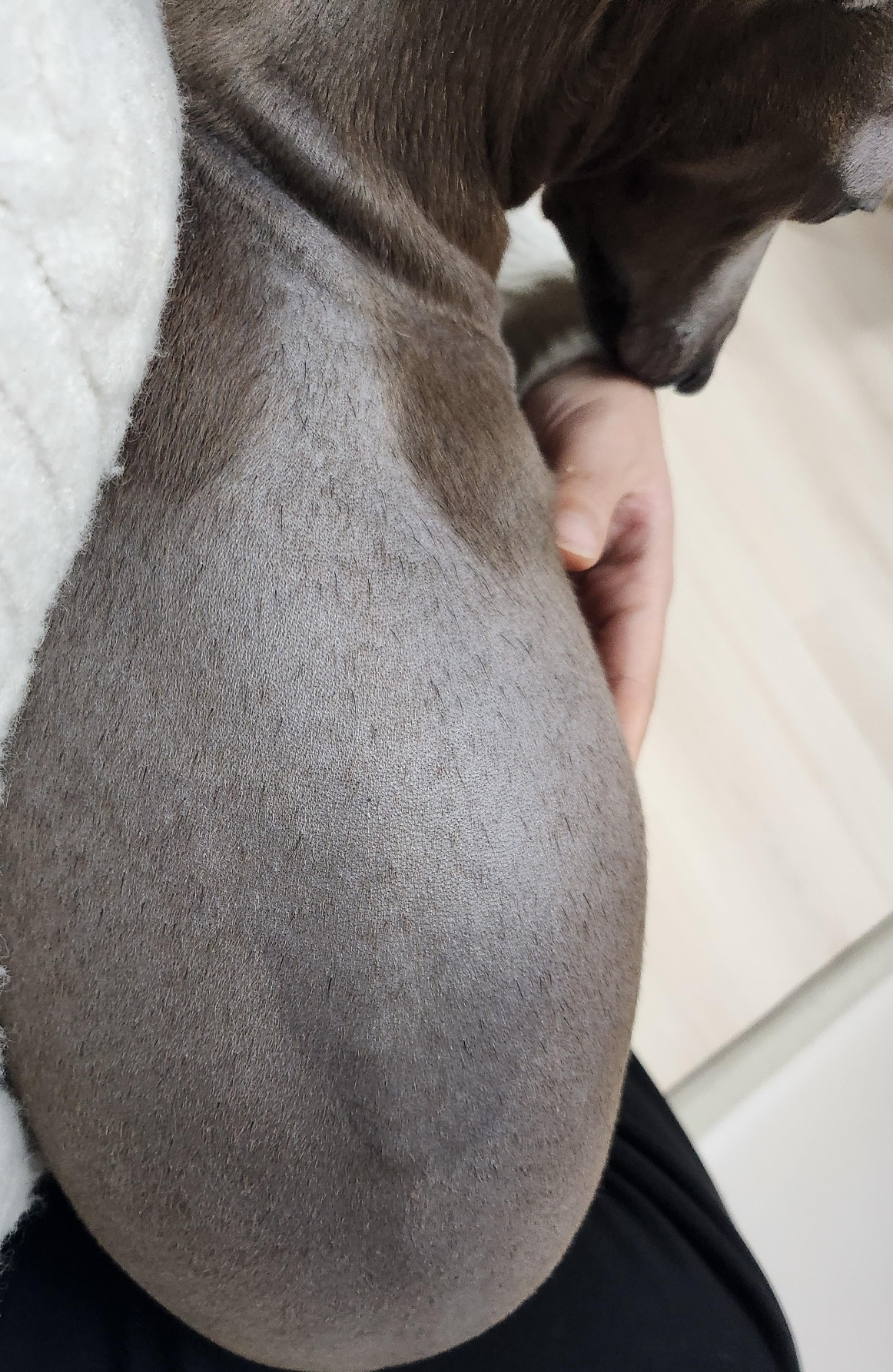 검색해봤을 때 다른 강아지들 상태와는 조금 다른 것 같긴 해요. 몇몇 증상이 심한 친구들은 상처 난 것처럼 빨갛더라고요. 엔비는 털만 빠져서 다행이라고 생각해야겠어요. (우리 모두 완치하자! 파이팅!)