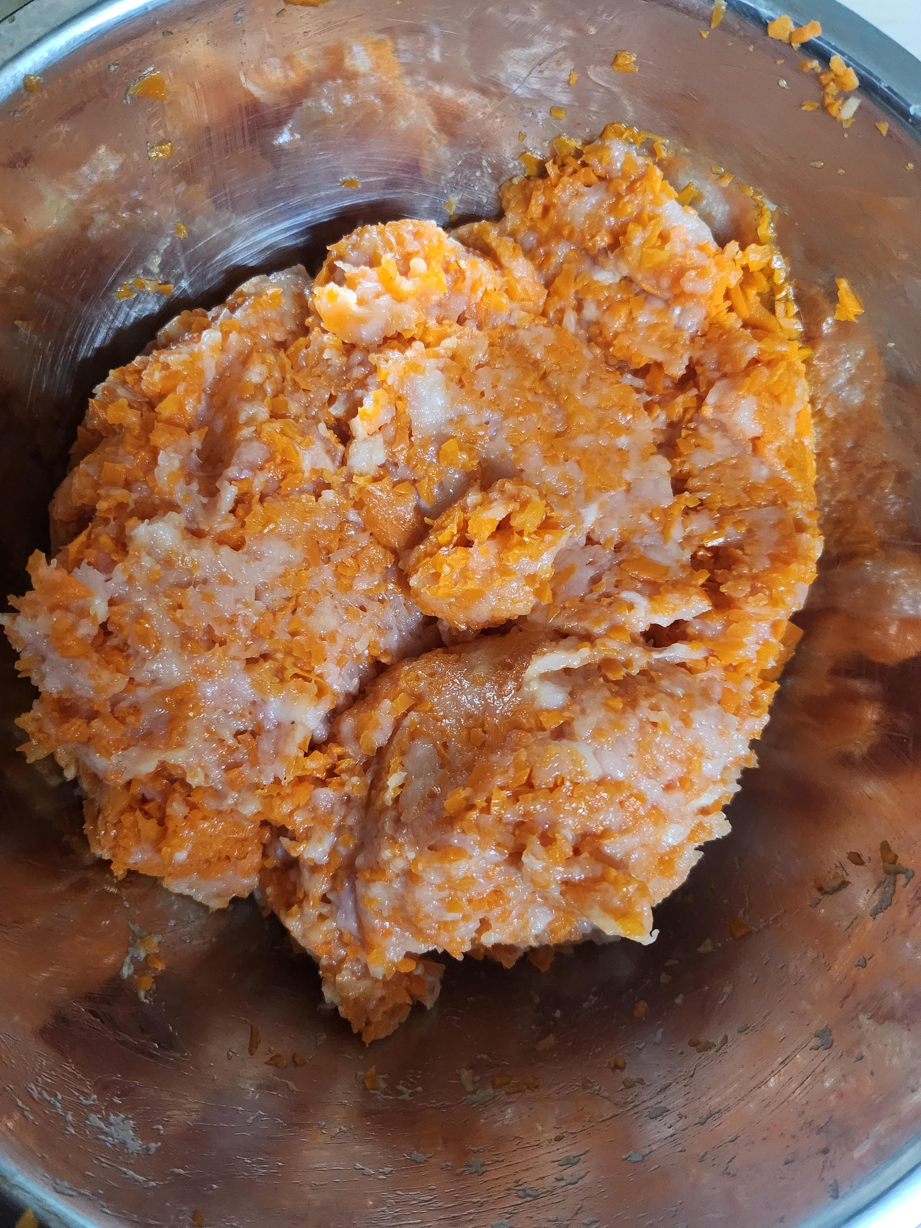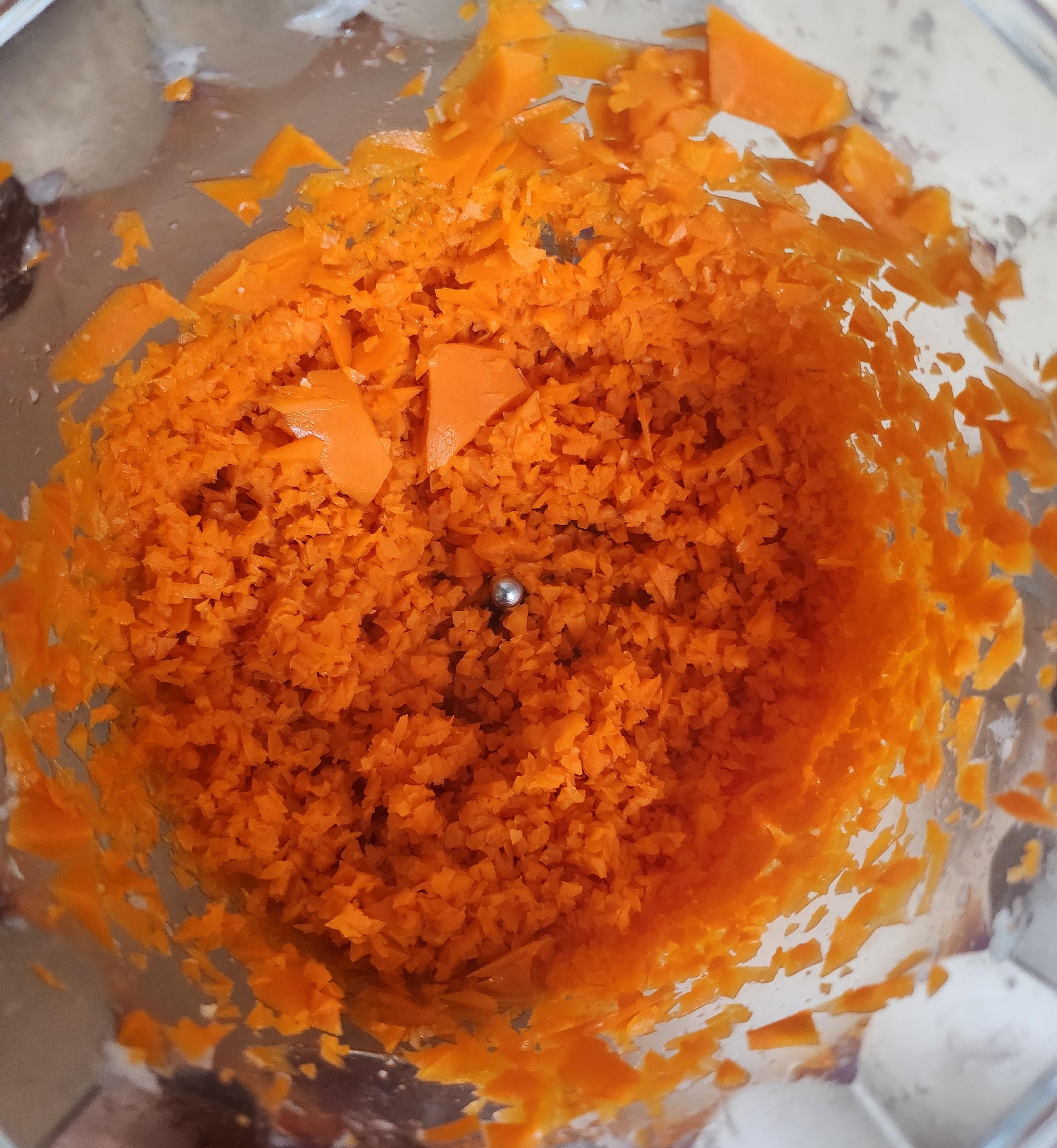 3. 해동된 닭가슴살을 믹서기에 갈고 당근과 섞어 반죽을 만듭니다.