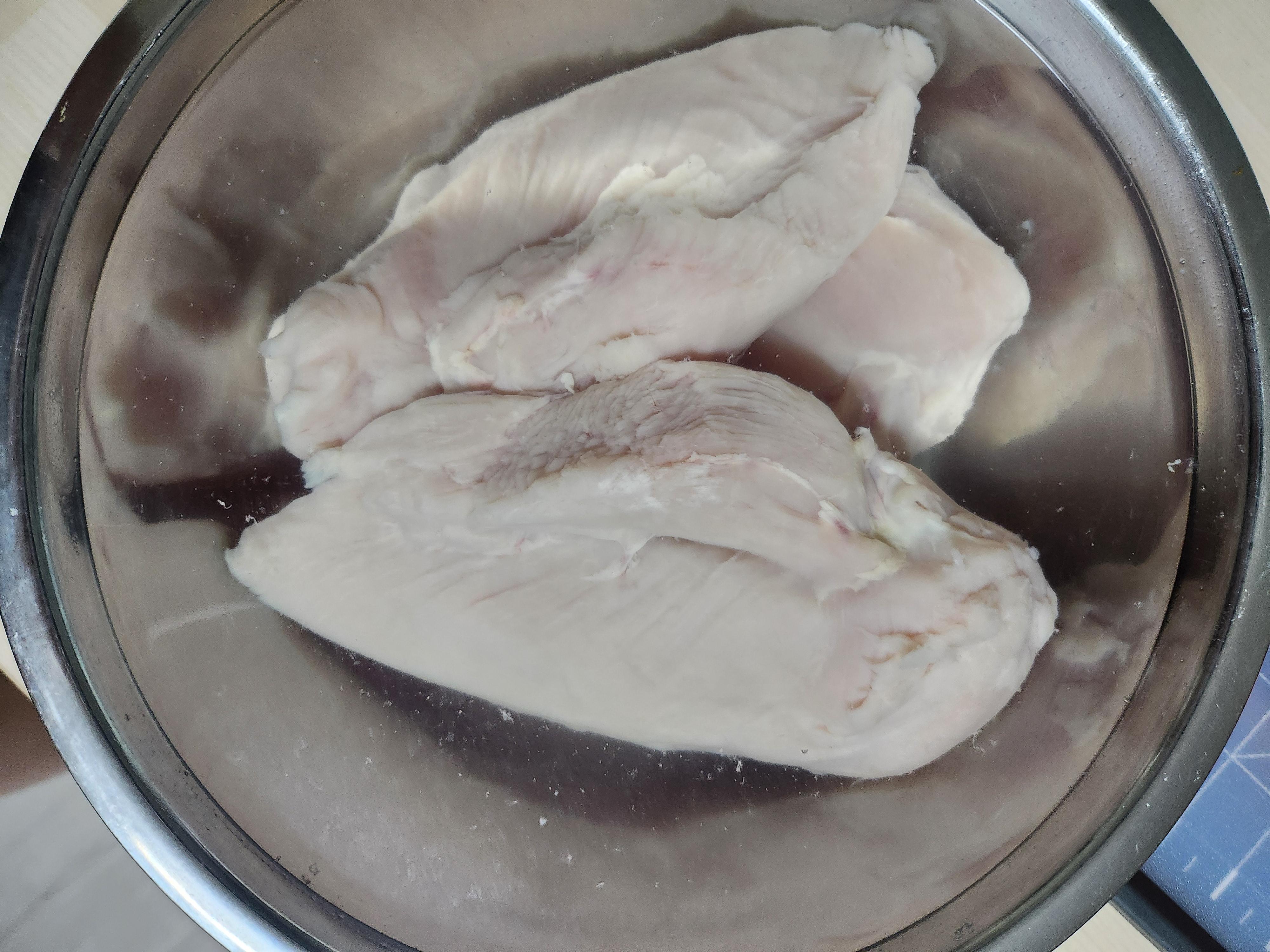 1. 저는 냉동 닭가슴살을 사용했어요. 찬물에 넣고 식초를 한 바퀴 둘러 냉장고에 넣고 살균 및 해동을 합니다.
