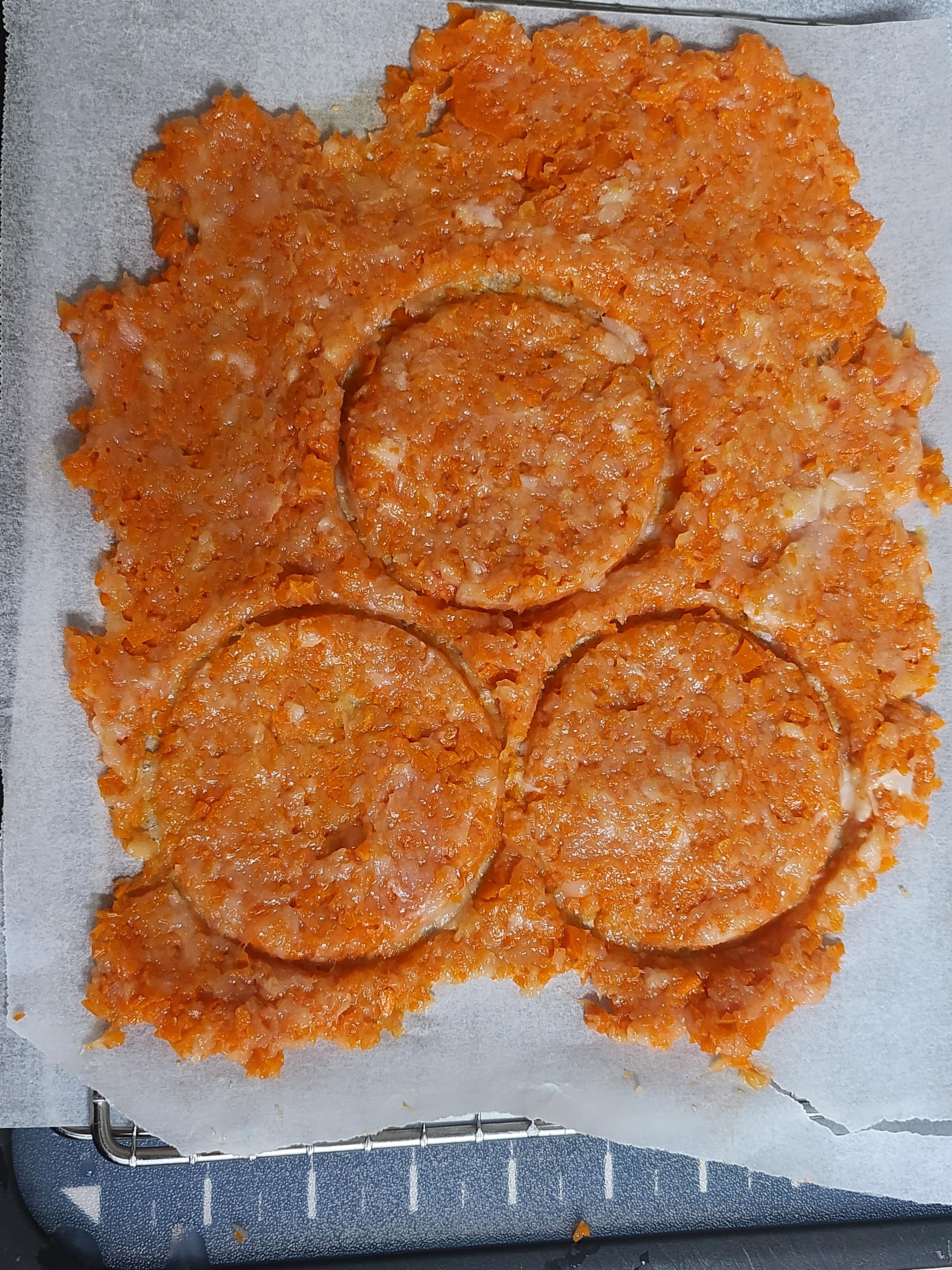4. 건조기 트레이에 종이 포일을 깔고 반죽을 얇게 펴줍니다. 어차피 건조되면 부서질 거라 각 잡고 펴지 않아도 돼요!