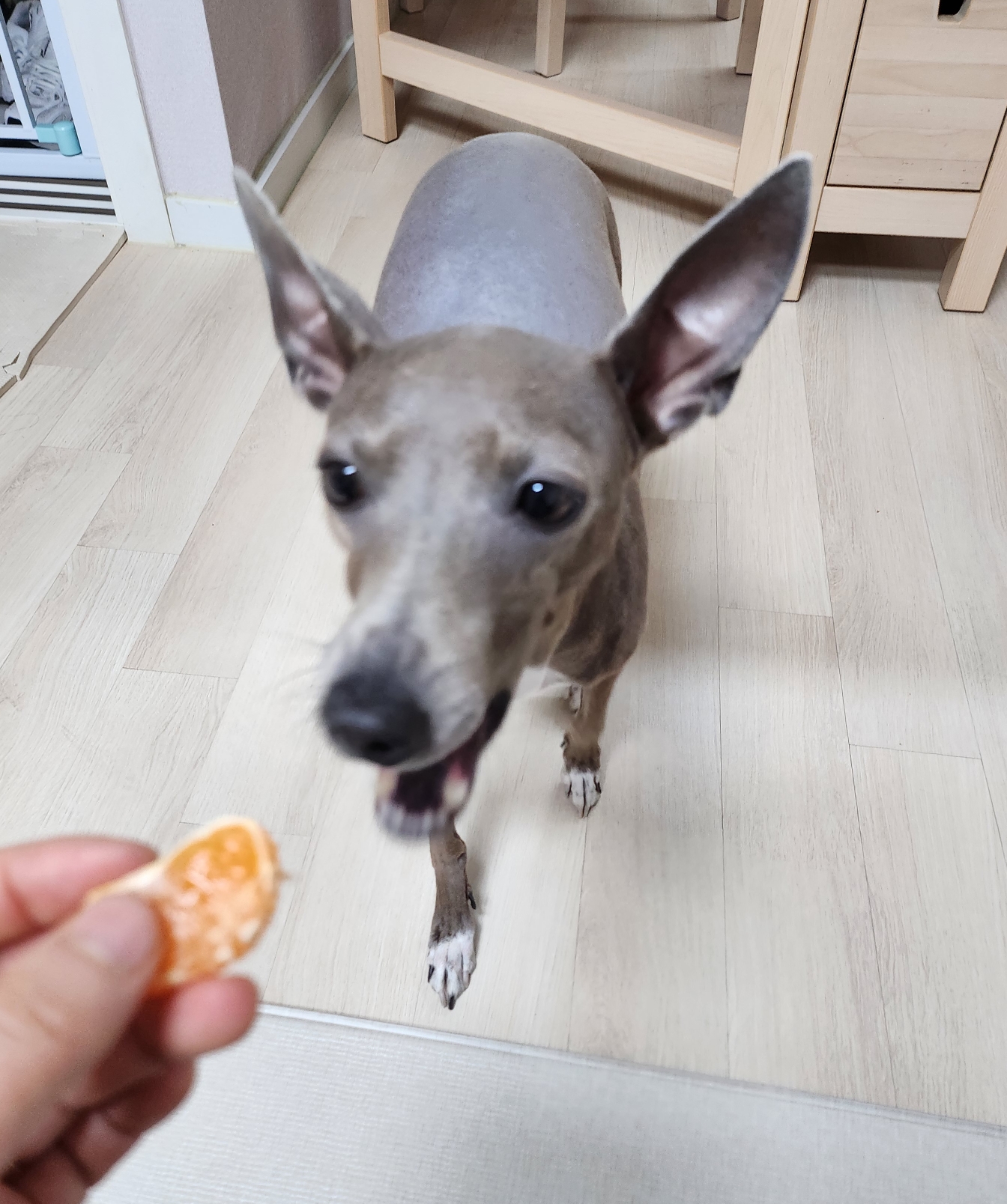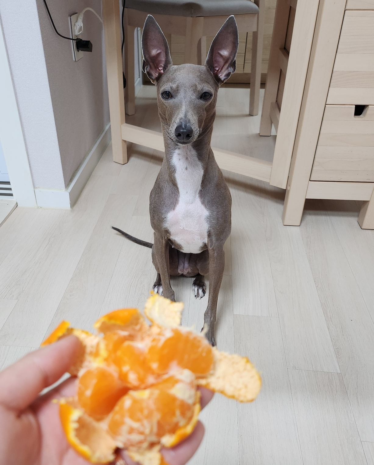 옆에서 강아지가 눈을 반짝반짝하고 있으면 귤을 주어야 할지 고민하는 분들이 많습니다.