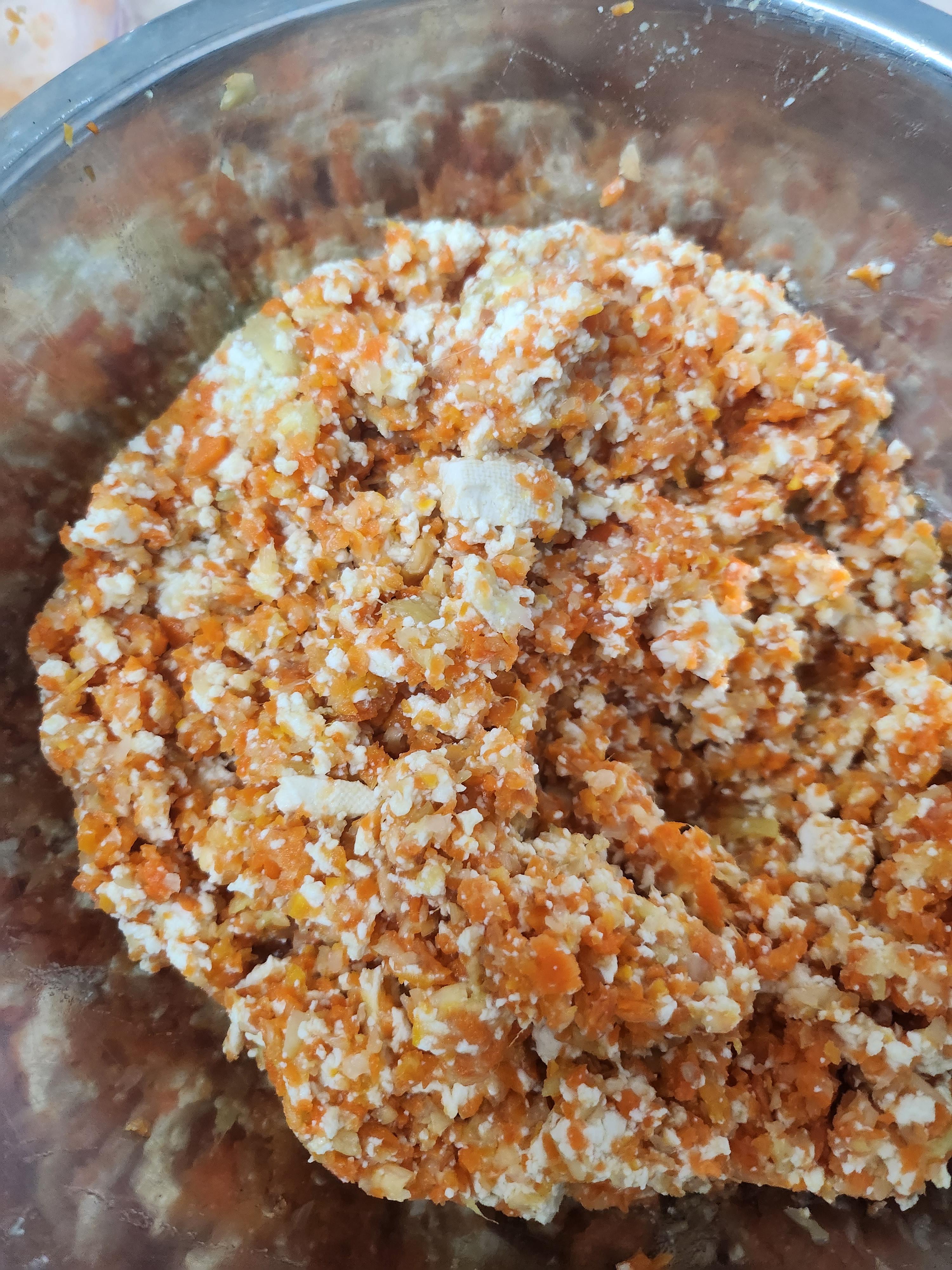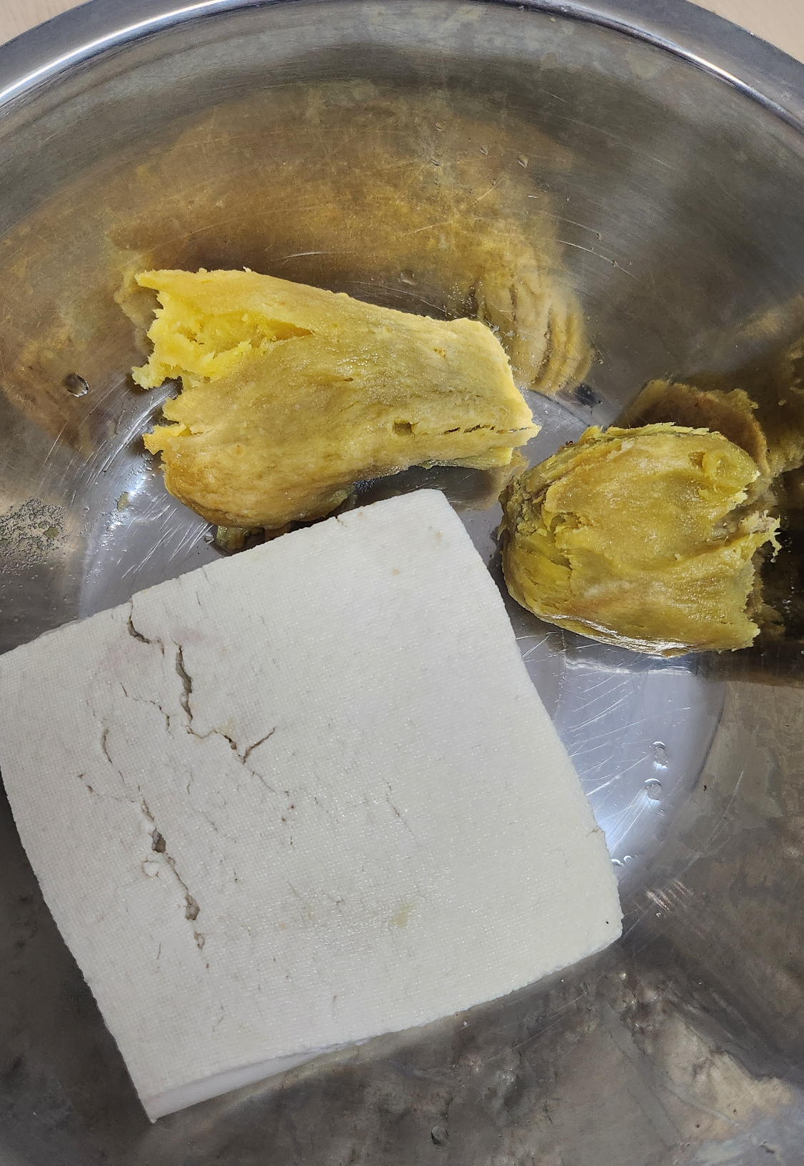 6. 위와 같은 과정을 거친 재료들을 다 섞으면 이렇게 됩니다. 이 상태로 먹어도 야채와 고구마의 단맛과 두부의 담백함이 느껴져서 맛있더라고요!