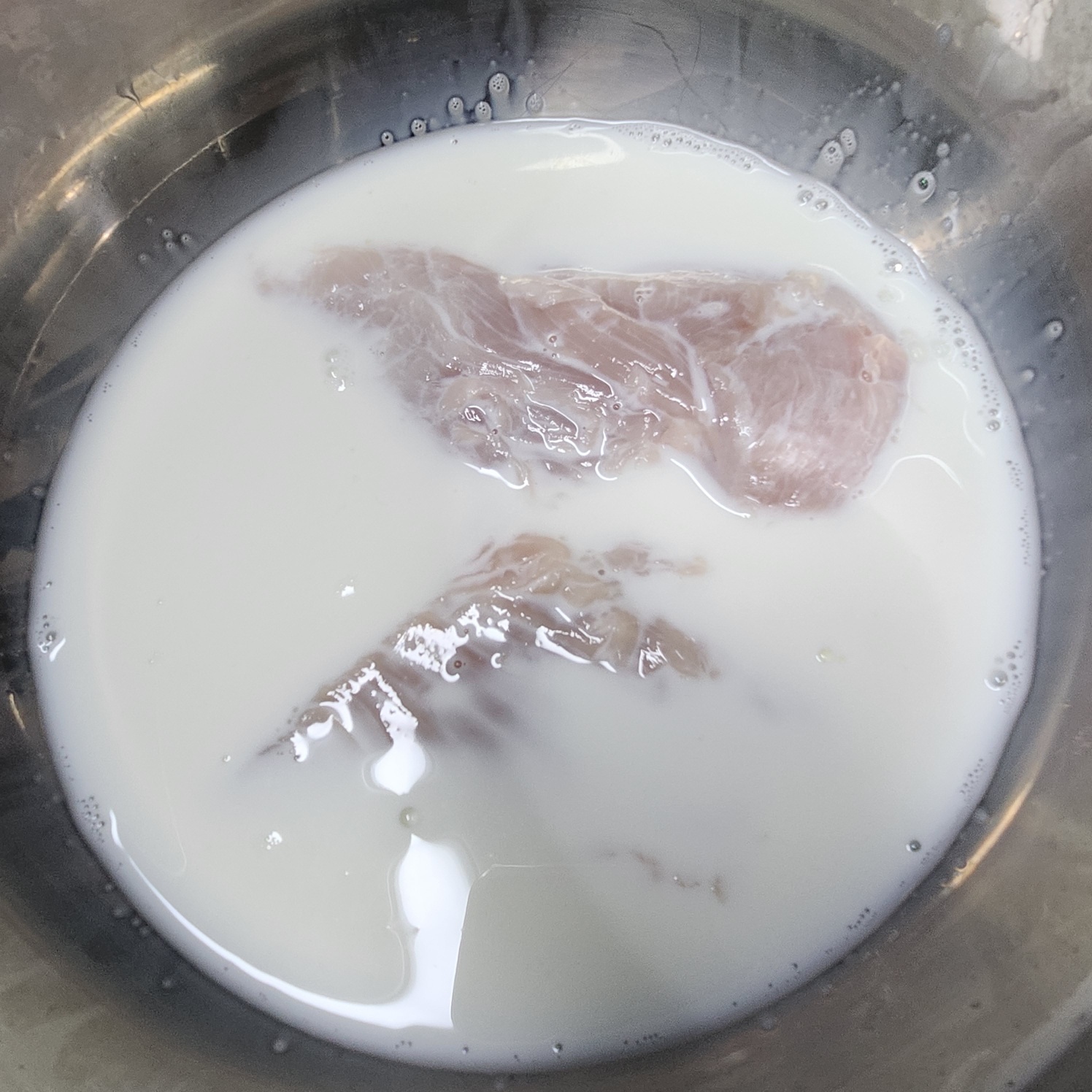 2. 식초 물을 따라내고 우유에 20분 정도 담가 연육과정을 거쳐줘요. 연육을 위한 것이긴 하지만 저는 혹시 몰라서 락토프리 우유를 사용했어요.