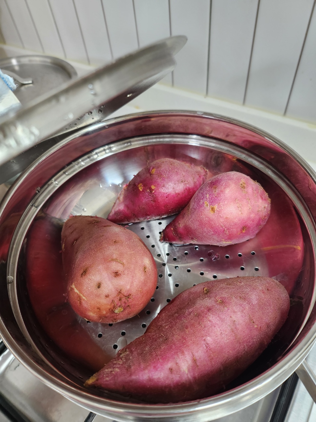 3. 닭가슴살이 준비되는 동안 고구마를 삶아줍니다. 조금 시간이 더 걸리긴 하지만 찜기를 사용하여 삶으면 너무 무르지 않고 단단하게 익어서 닭가슴살을 말 때 좋아요~