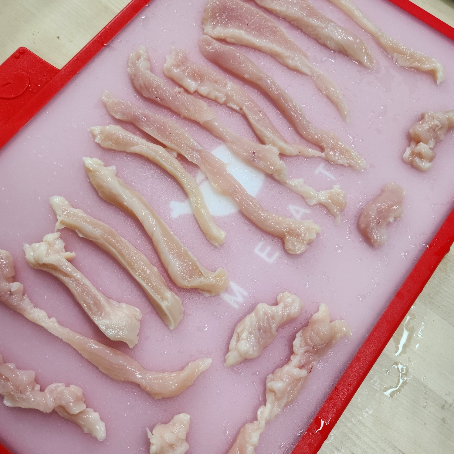 5. 닭가슴살은 얇고 길게 잘라줍니다.