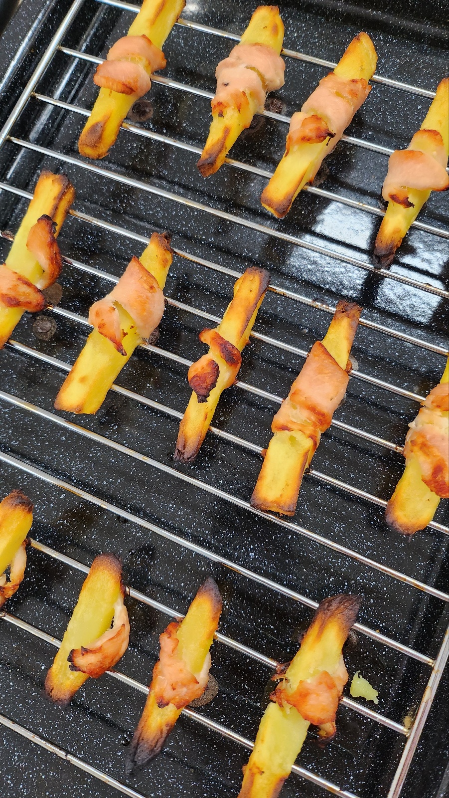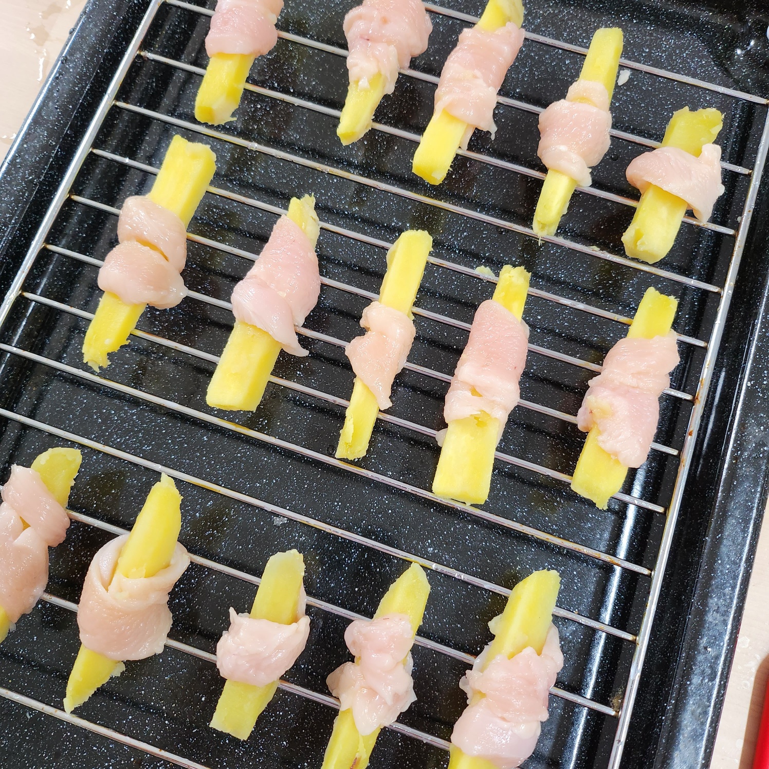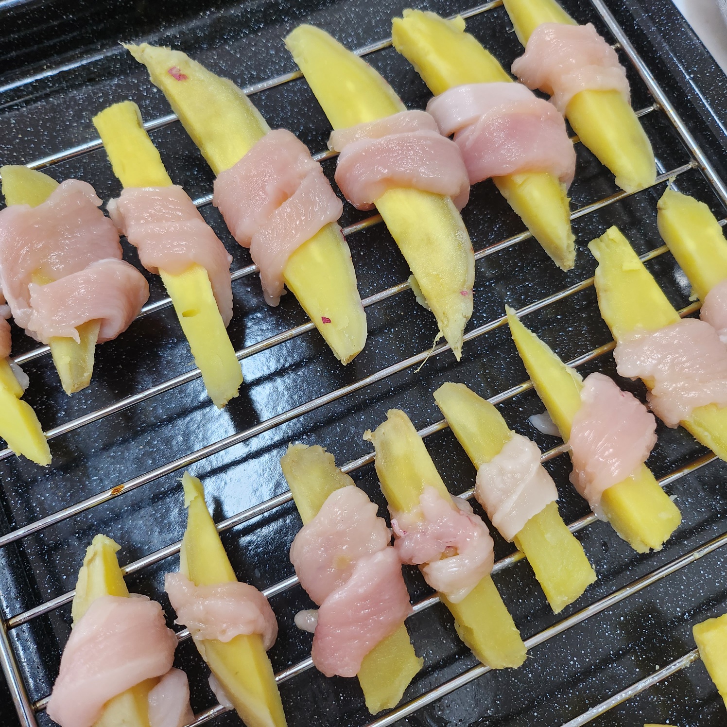 6. 200도 정도로 오븐을 예열을 하고 고구마에 닭가슴살을 말아 구울 준비를 해줍니다. 크기도 모양도 제 멋대로지만 나름 만족스러워요