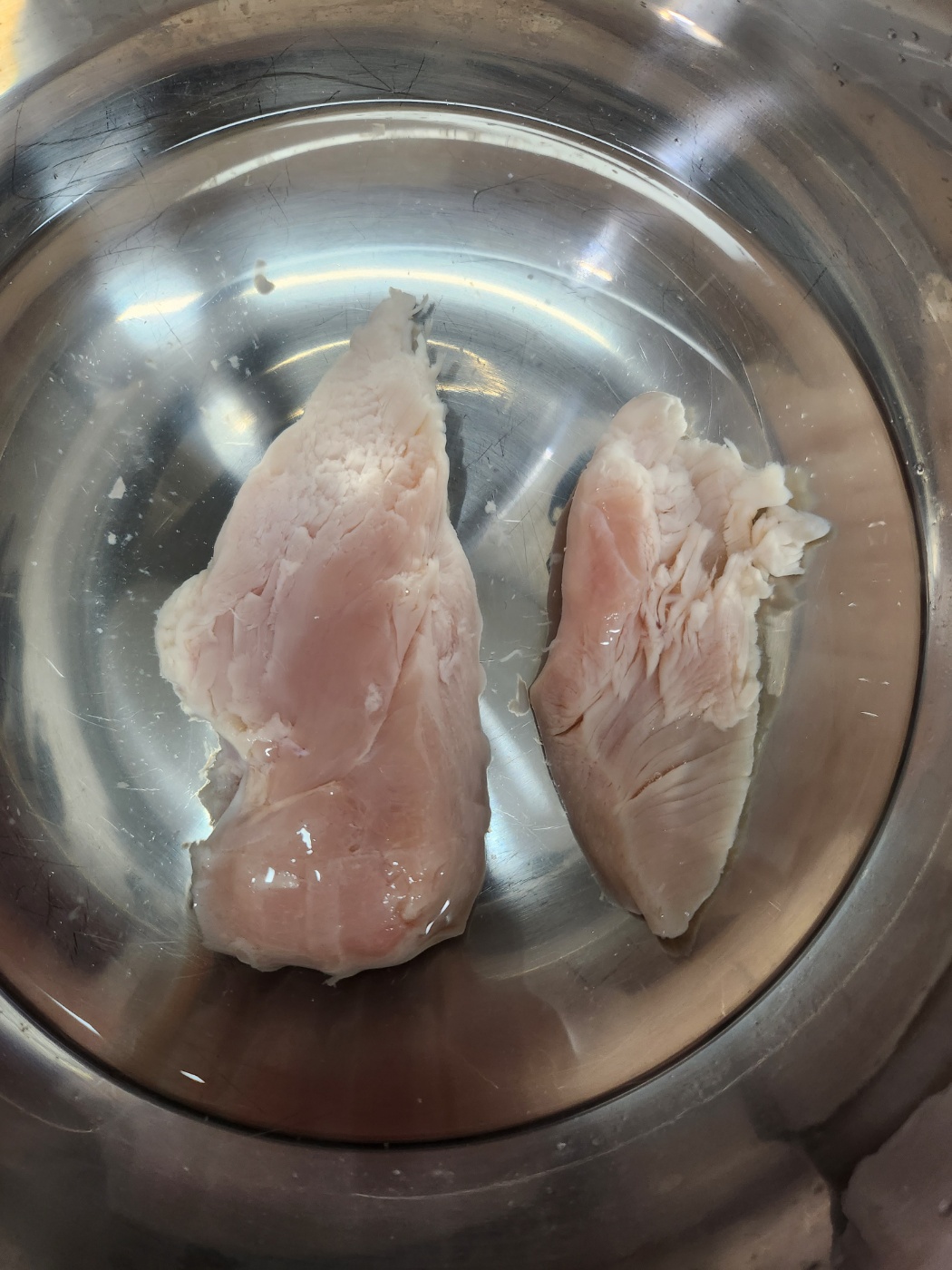 1. 먼저 닭가슴살을 물에 담그고 식초를 3스푼 넣어 20분 정도 살균해요.