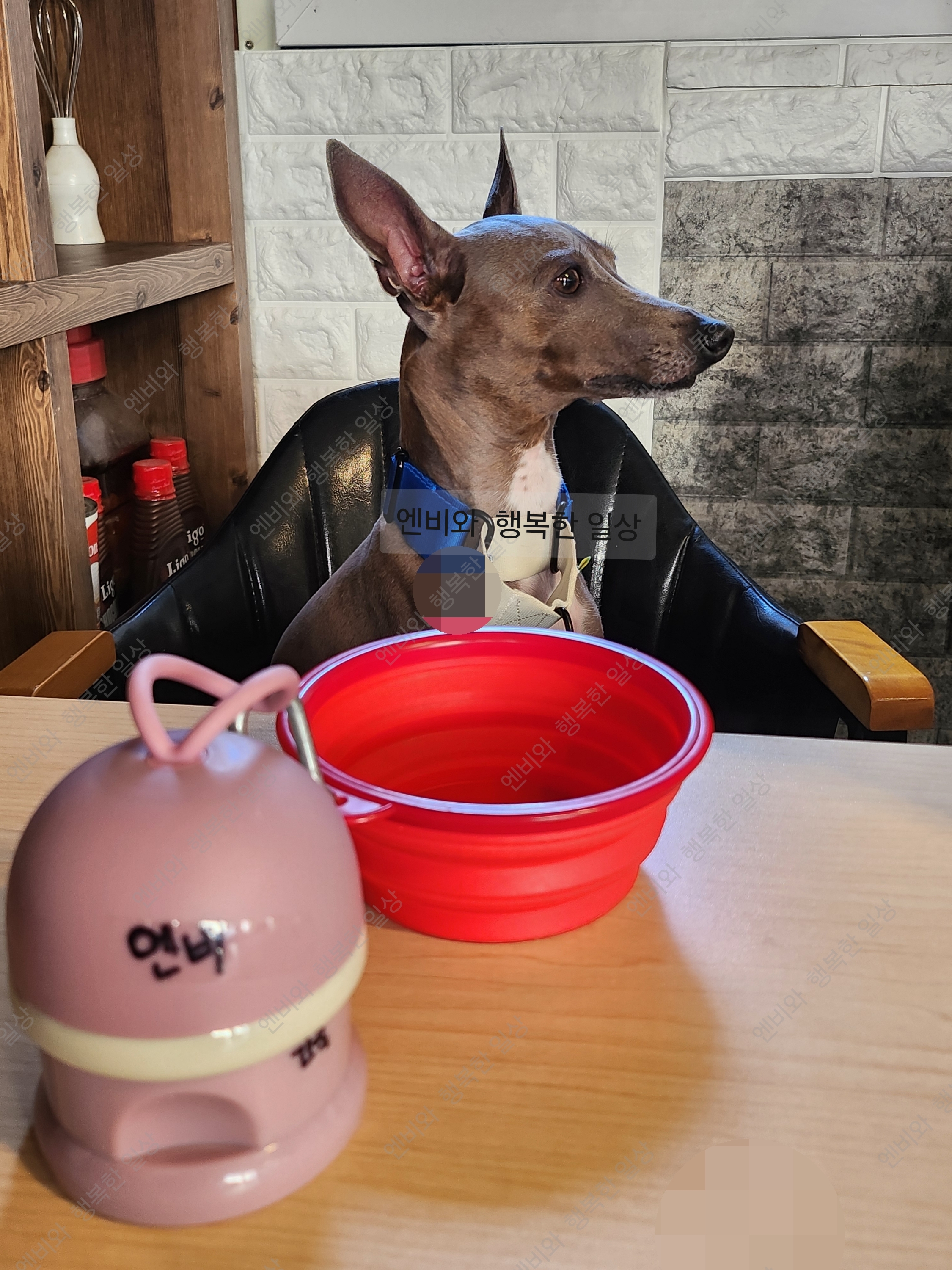 엔비도 얌전히 앉아 간식과 밥을 먹었어요.