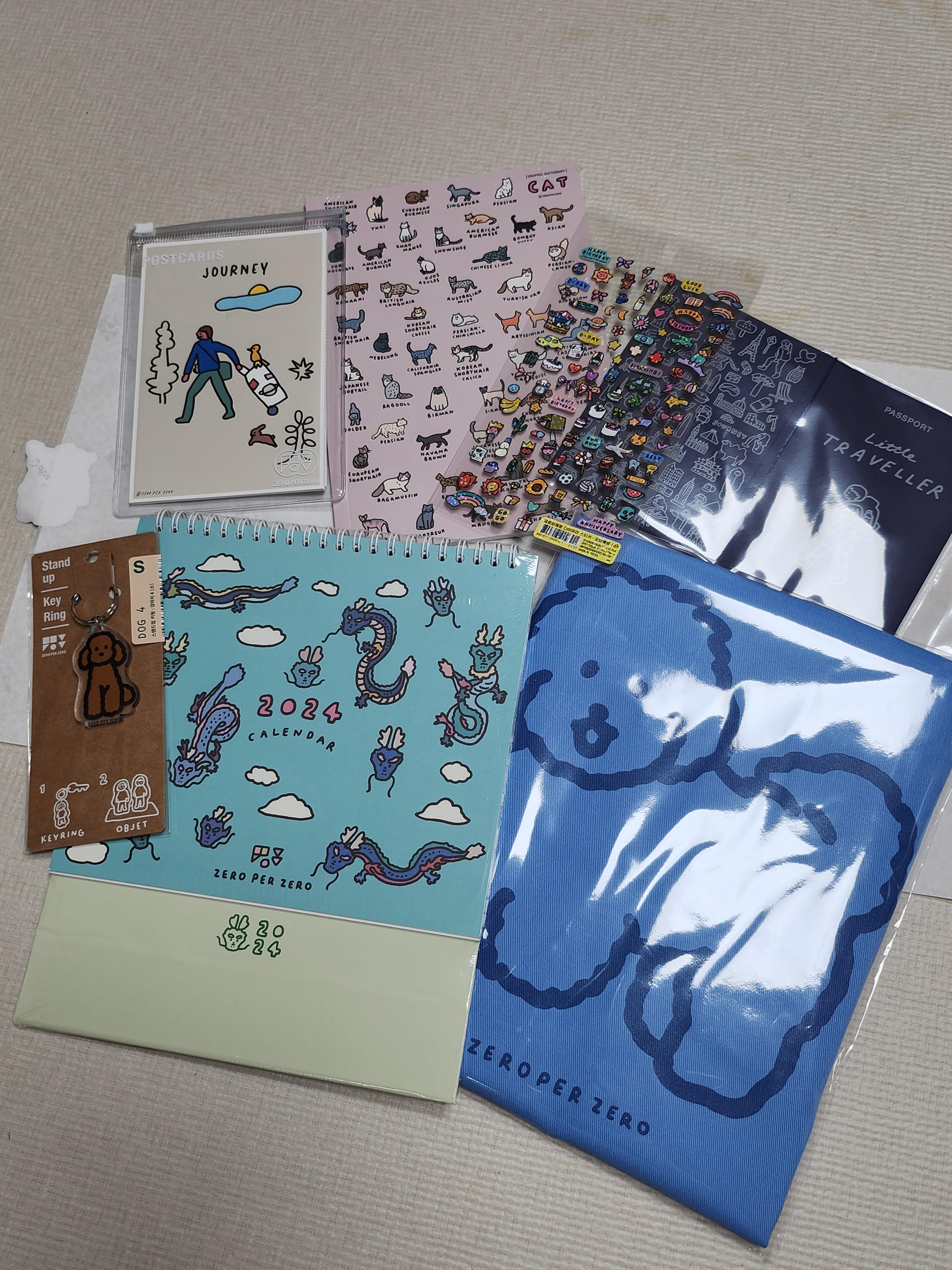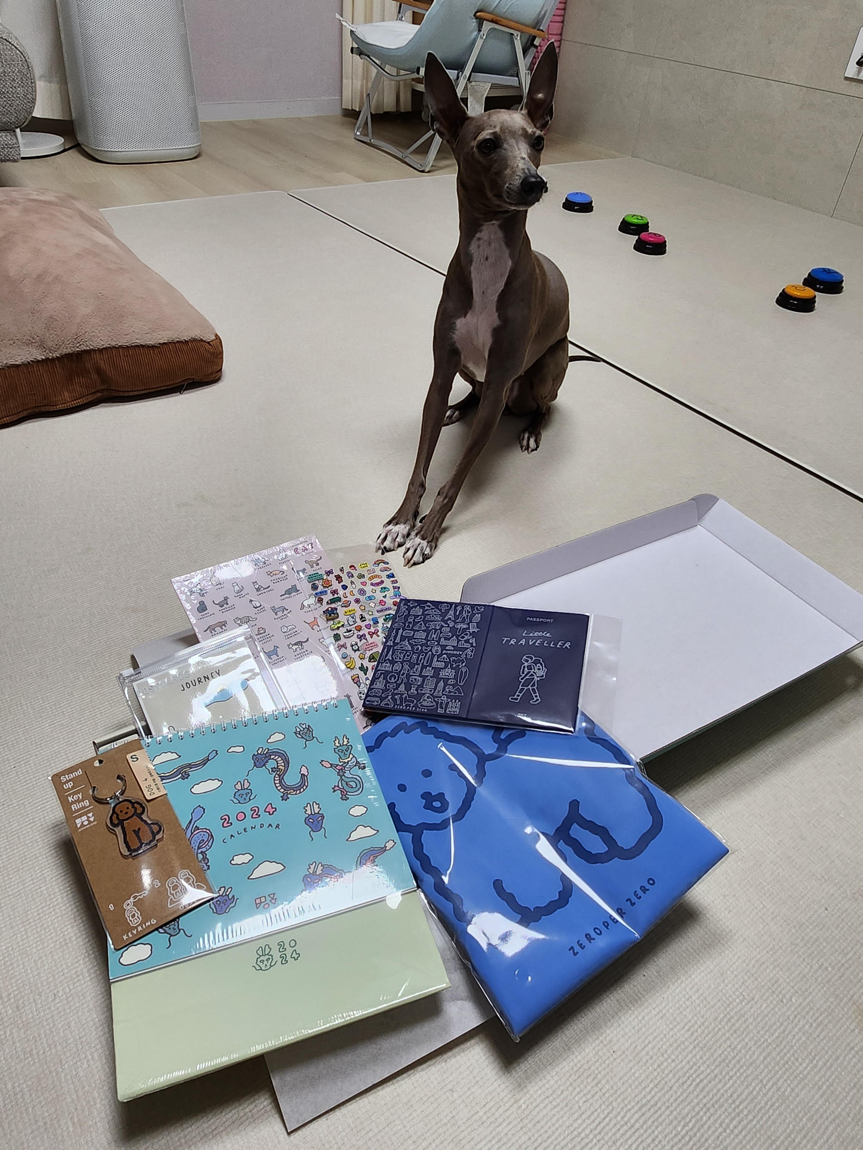 2024년 달력, 푸들키링, 에코백, 스티커, 노트, 여권 케이스, 아코디언북?으로 구성되어 있었어요.