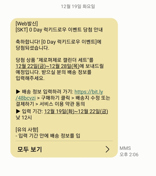 저는 어차피 광고문자도 많이 오는 사람인지라 그냥 엔간한 이벤트에 거의 응모하는 편인데요. 그중에서 0 데이 럭키드로우 이벤트 제로퍼제로 캘린더 세트에 응모했고 응모한 지도 모르고 있었을 때 당첨 문자가 왔어요.