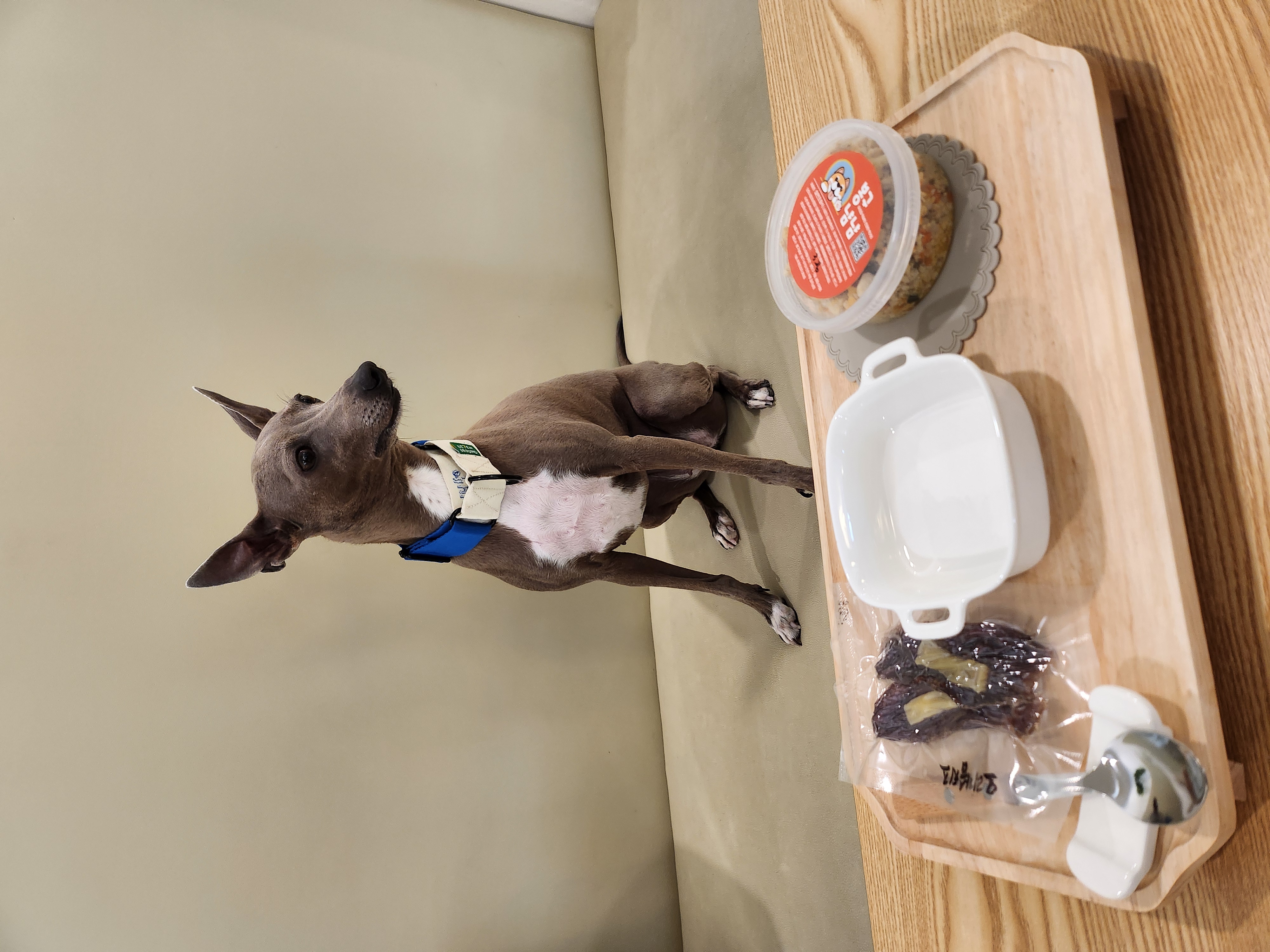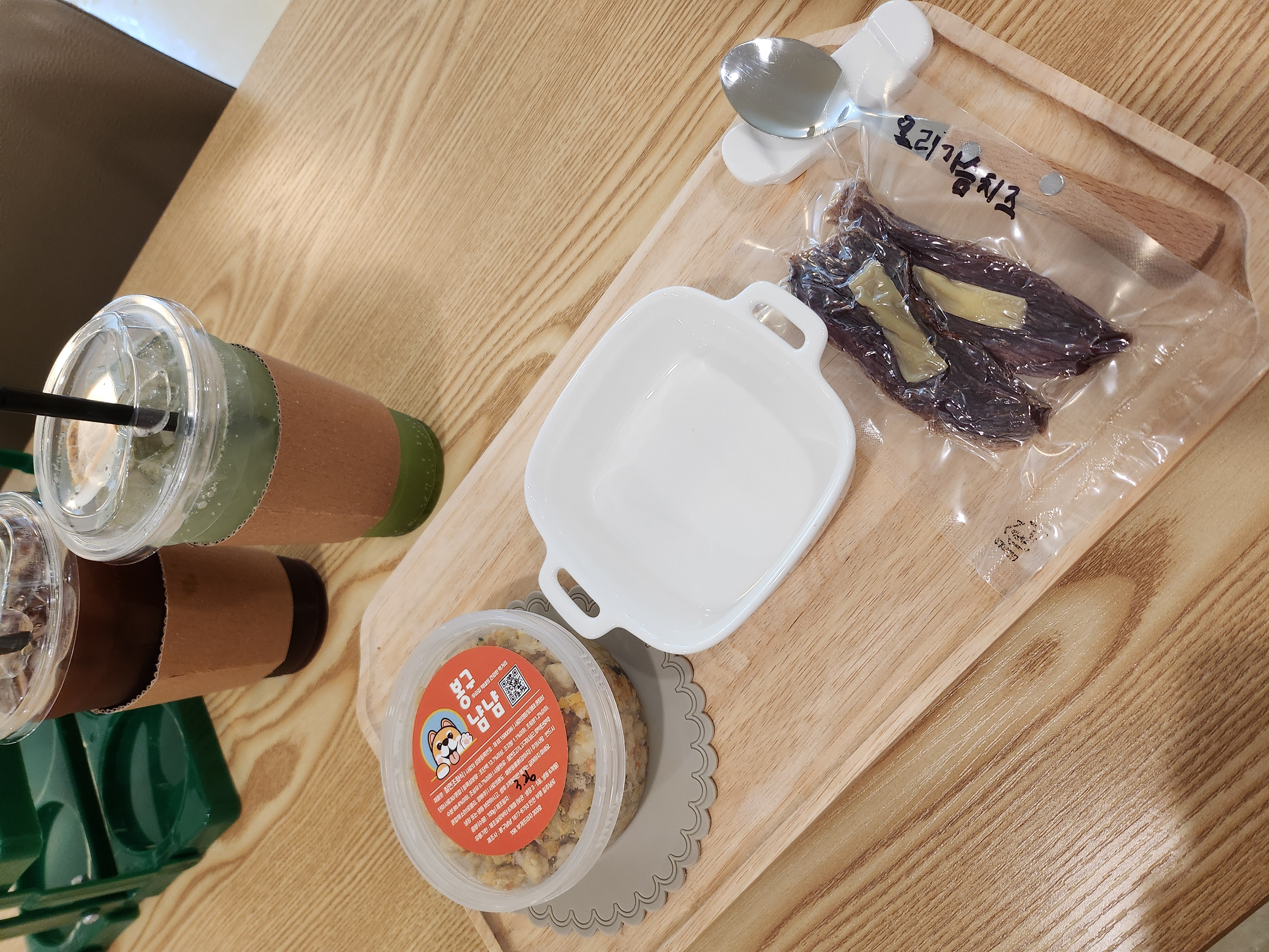 밥은 먹고 왔지만 아직 배가 고픈 엔비도 화식과 간식을 구매했어요. 먹기 좋게 화식을 데워주셨고 전용 그릇과 쟁반까지 주셔서 푸짐한 한 상을 받는 멈머가 되었네요.