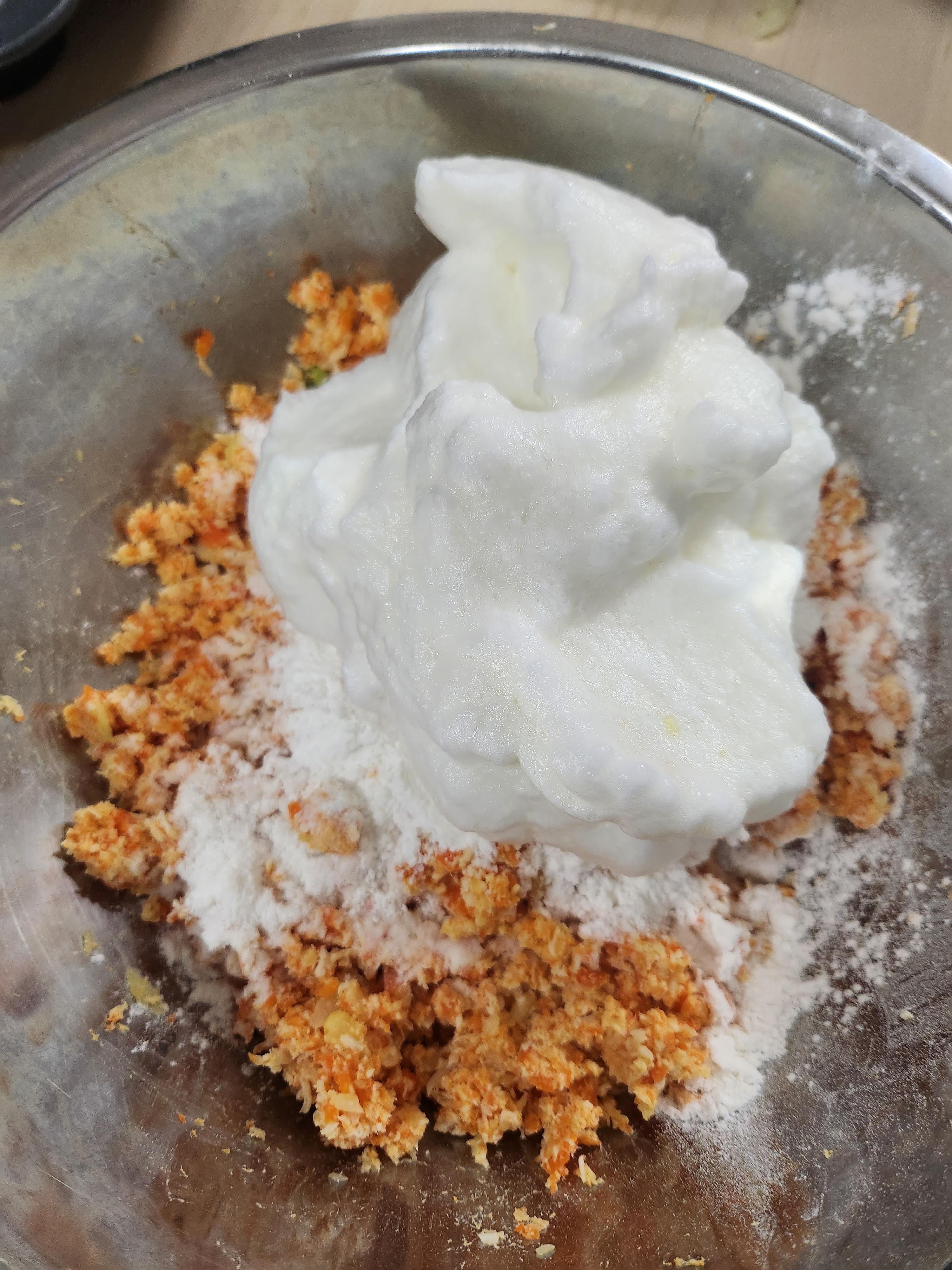 5. 달걀을 흰자만 넣고 꿀을 1티스푼 넣어 뿔이 올라올때까지 머랭을 친 뒤 4번과 함께 섞어줍니다. (이때 거품이 꺼지지 않도록 살살 섞어주세요!)