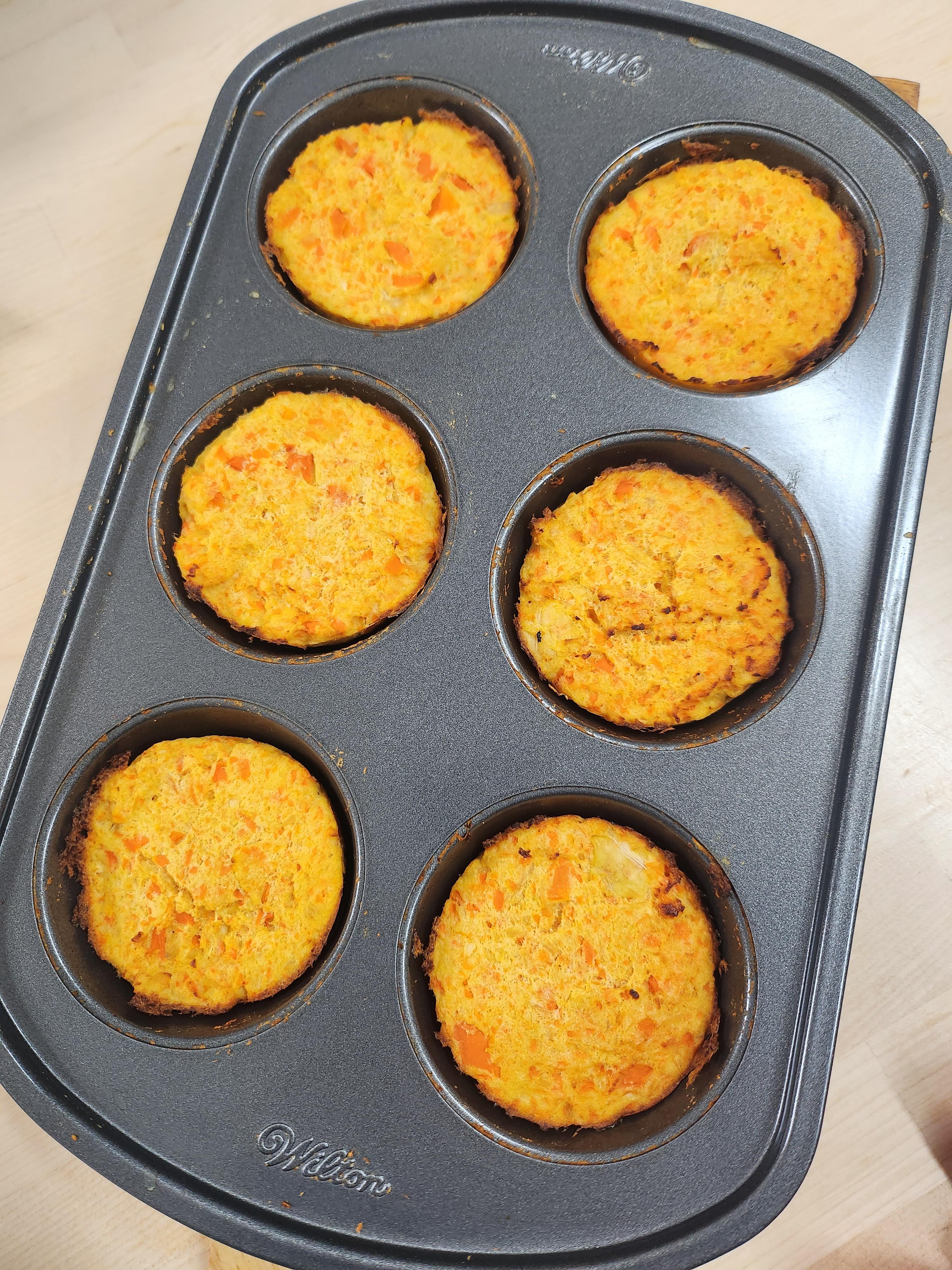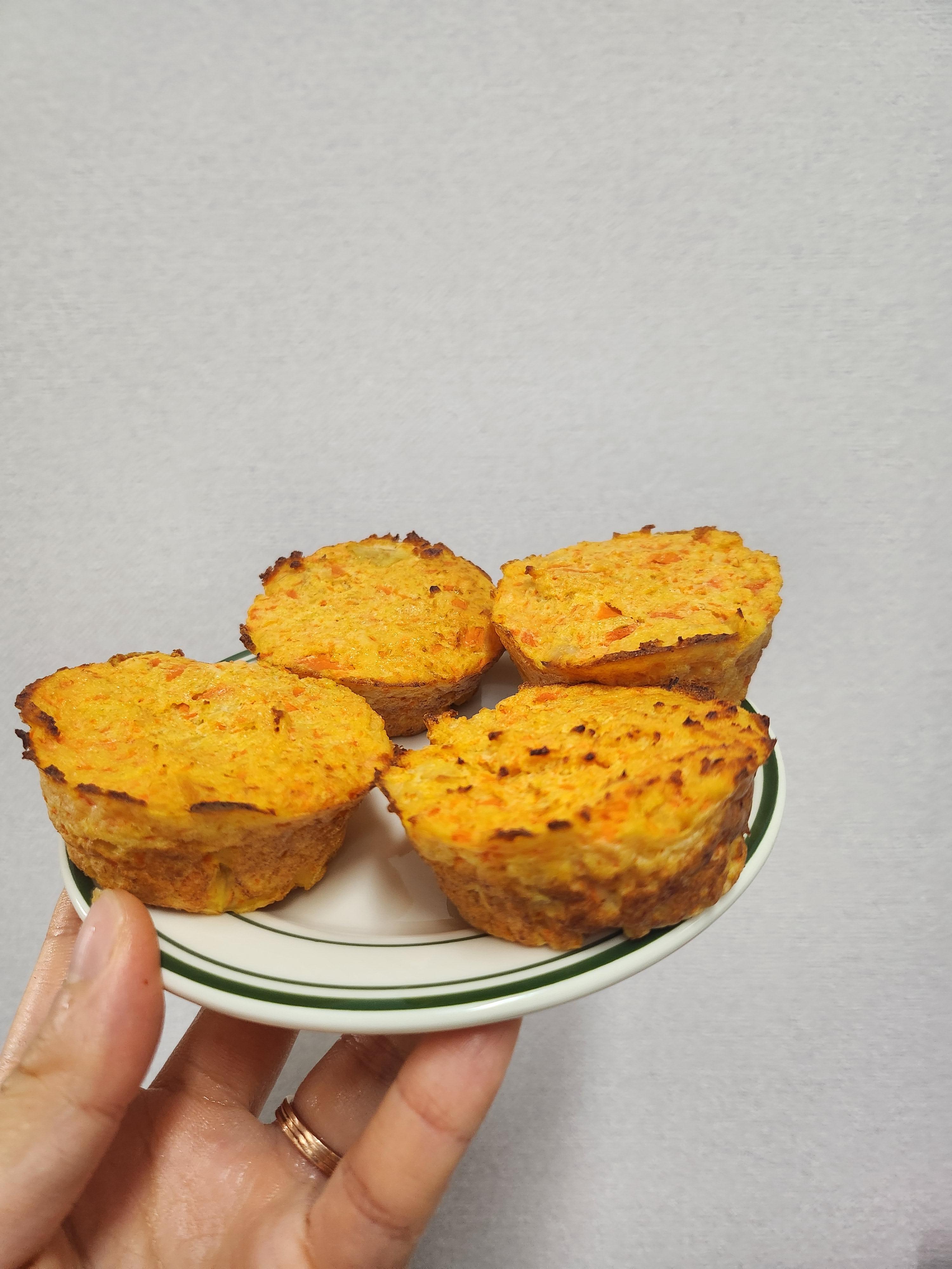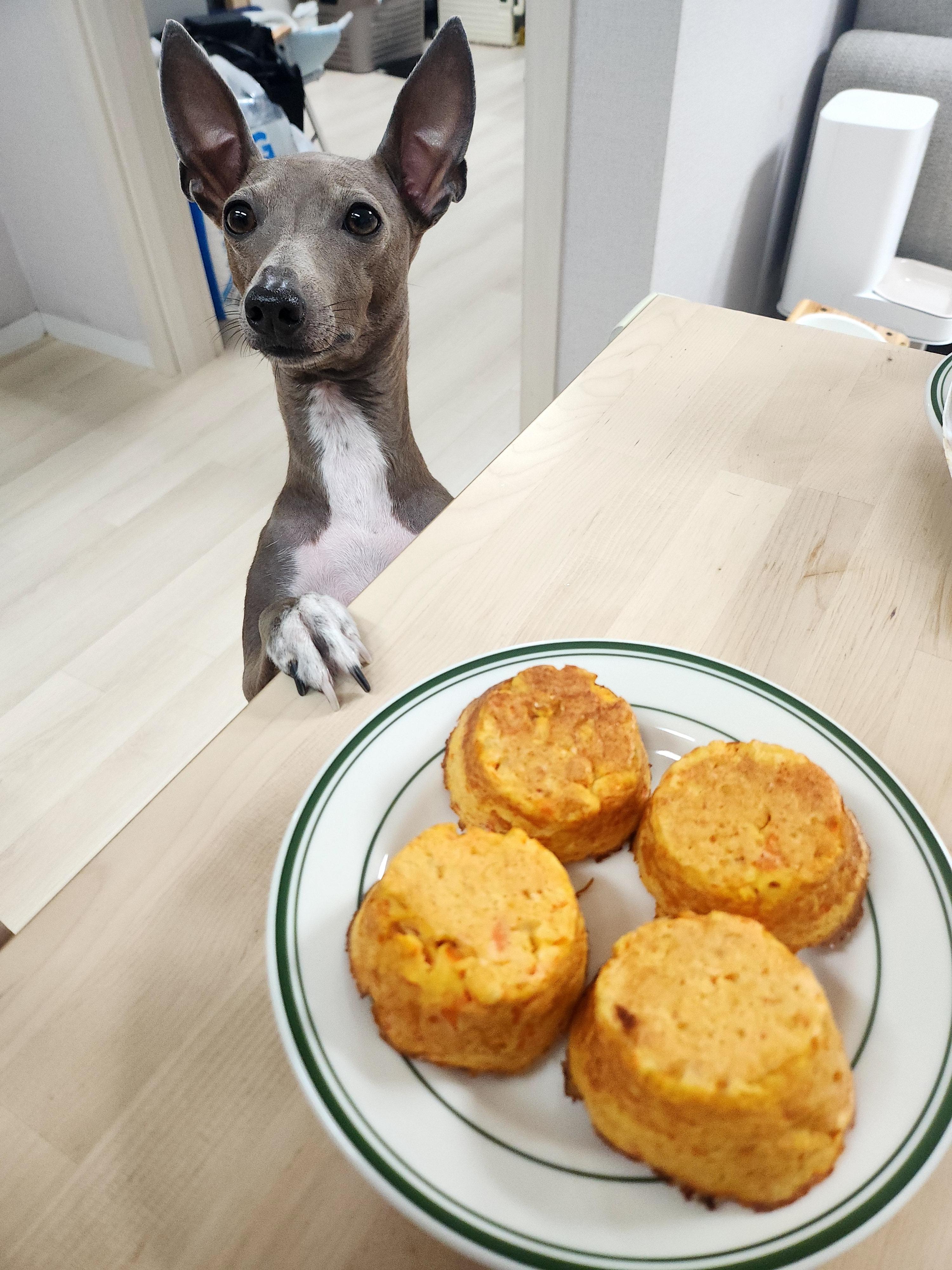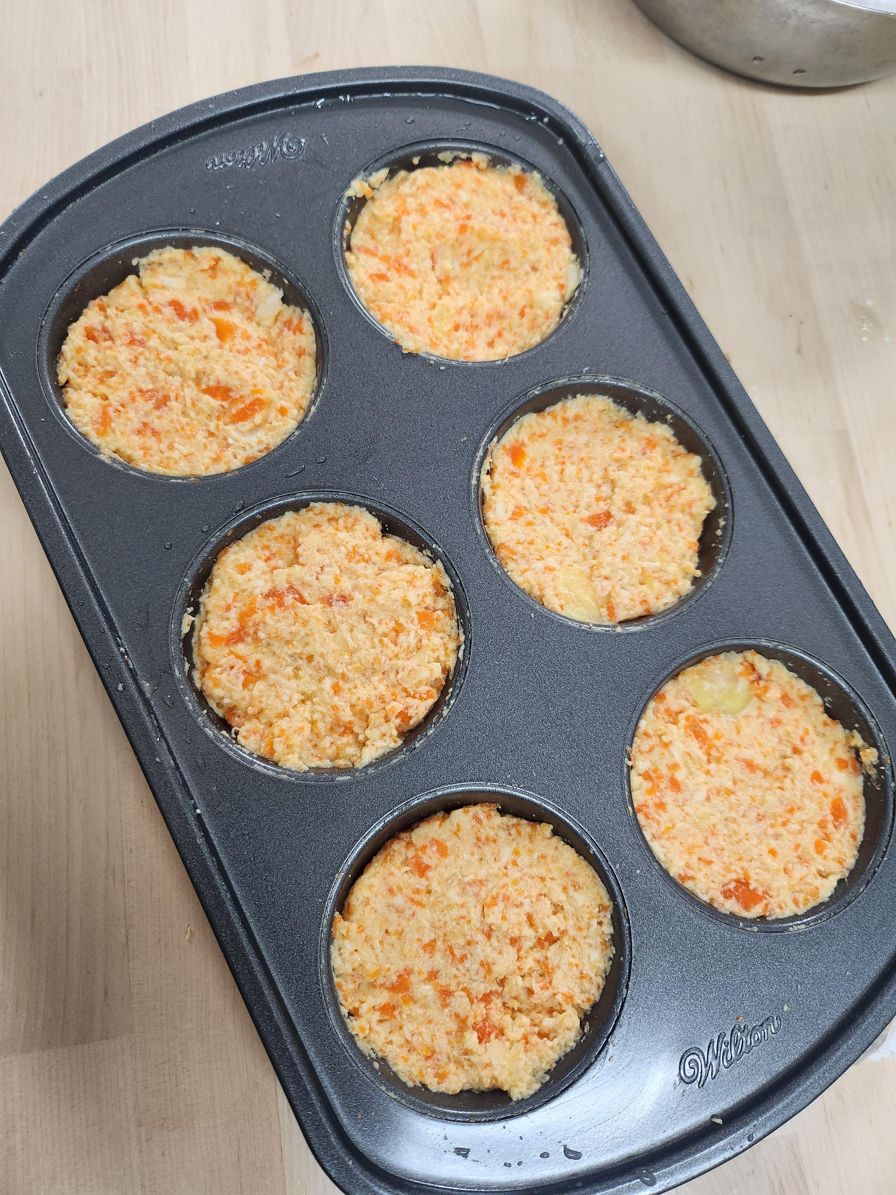 닭가슴살 2덩이, 당근 반개, 양배추 조금(야채는 강아지가 좋아하는 거 넣어주세요), 계란 3알, 꿀 1티스푼 쌀가루 50g, 머핀틀(없으면 종이컵 6개)