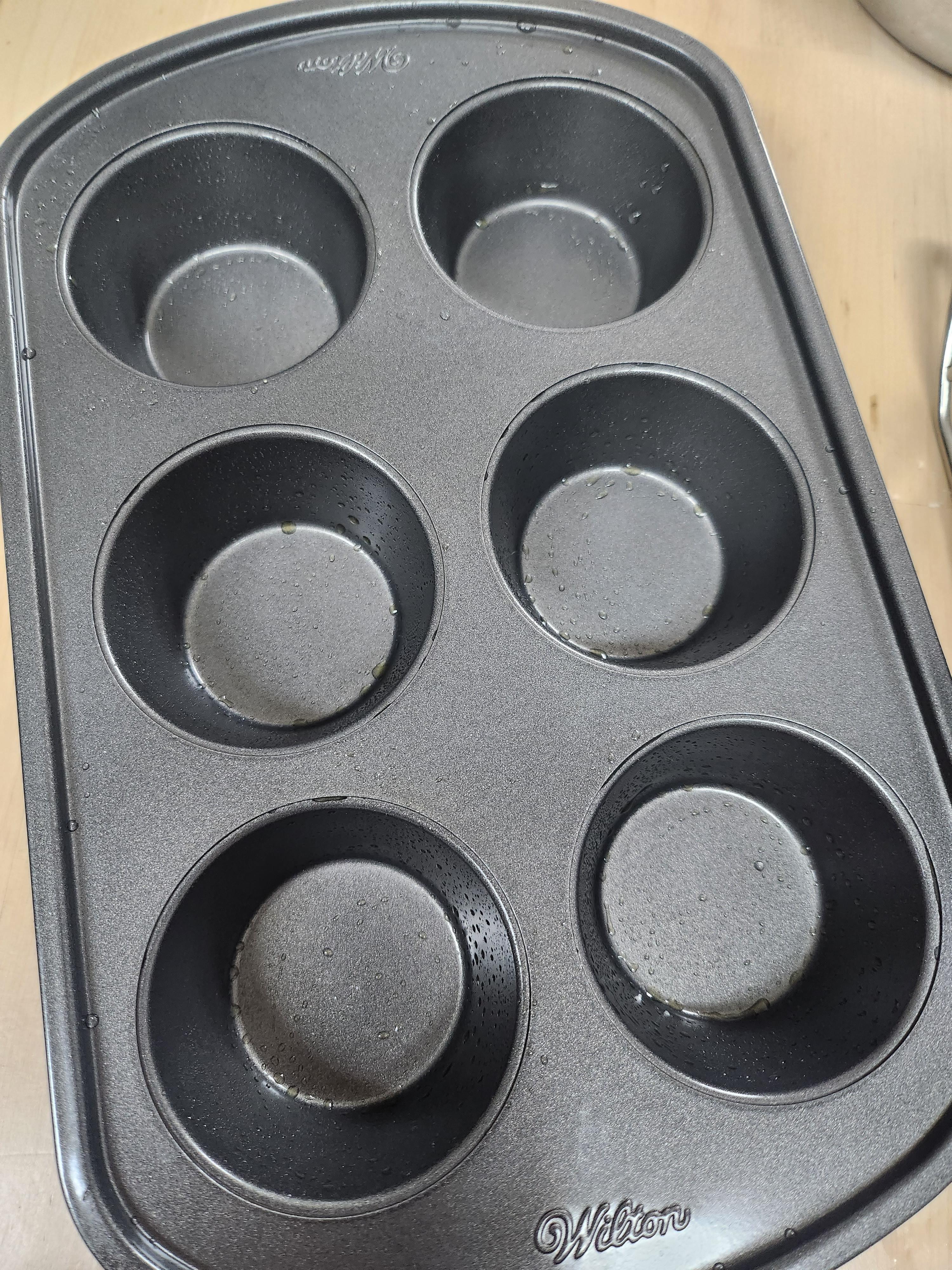 6. 머핀 틀에 올리브유를 살짝 발라줍니다. 강아지 간식이니 포도씨유는 절대 안돼요! ( 머핀틀이 없을 시 종이컵을 이용하셔도 됩니다)