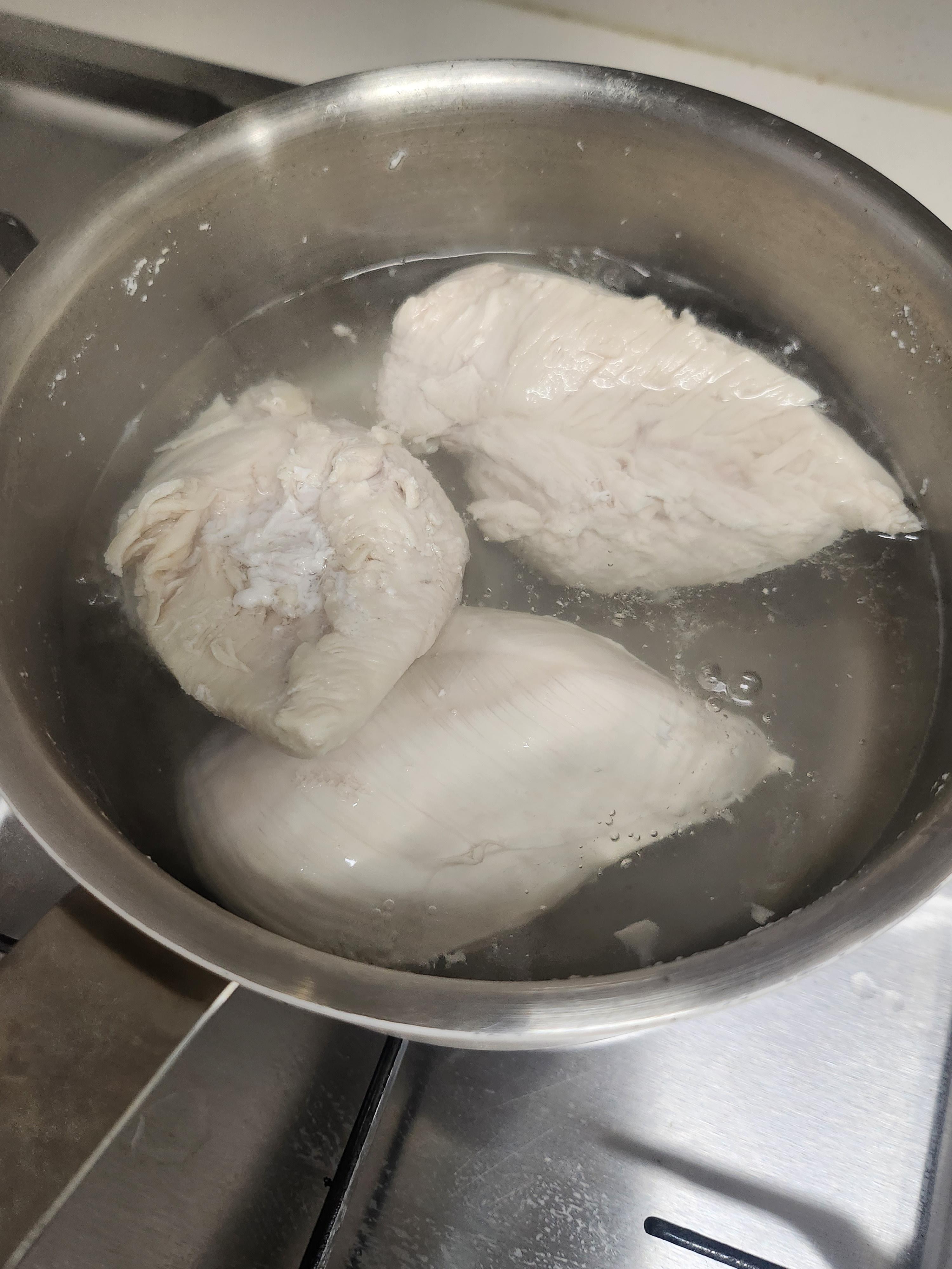 2. 닭가슴살을 삶고, 야채들을 살짝 데쳐줍니다. 당근은 살짝 물렁해질때까지, 양배추는 한 2분만 끓는 물에 넣었다가 빼줬습니다.
